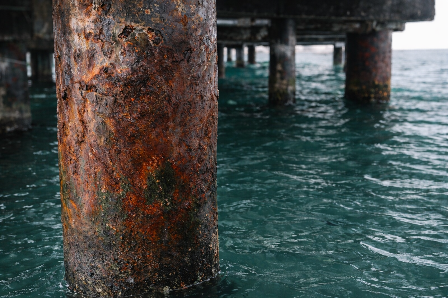 En pilotes metálicos, esta es una de las señales más claras de riesgo estructural, especialmente si el daño está en la zona de salpicadura, línea de agua, marea o cerca de conexiones. En pilotes de concreto, el equivalente sería el desprendimiento con acero expuesto y deteriorado.