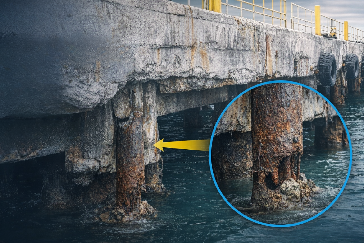 Un pilote no necesita romperse por completo para convertirse en un problema serio. En muchos muelles, el riesgo estructural empieza mucho antes del colapso: aparece como una pérdida de espesor, una grieta que crece, una inclinación leve o una socavación que no se ve desde la superficie. El problema es que, cuando estas señales se interpretan como simple desgaste, la estructura sigue operando mientras su margen de seguridad se reduce.